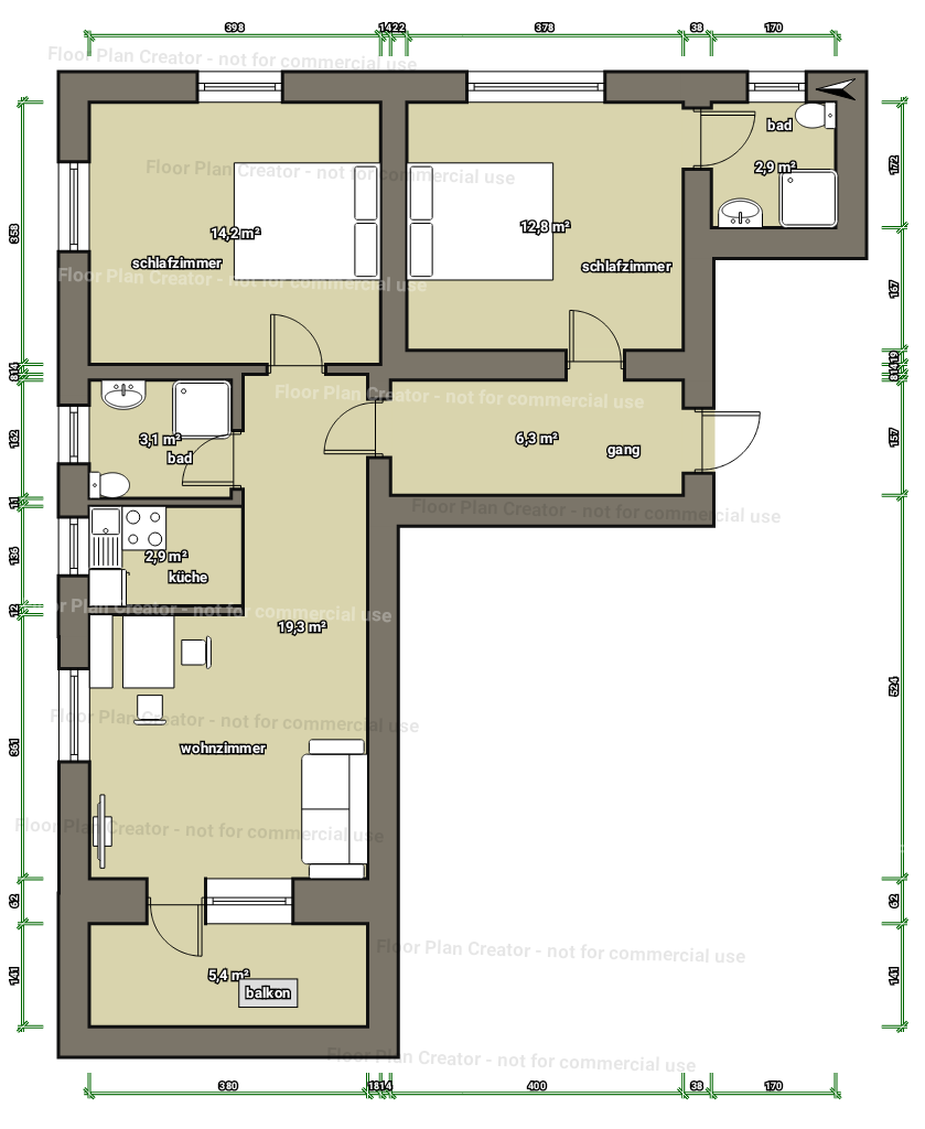 > Kochnische: Kochplatten, Kühlschrank, Wasserkocher, Ess- und Kochgeschirr, Geschirrtücher, Mikrowelle, Geschirrspüler